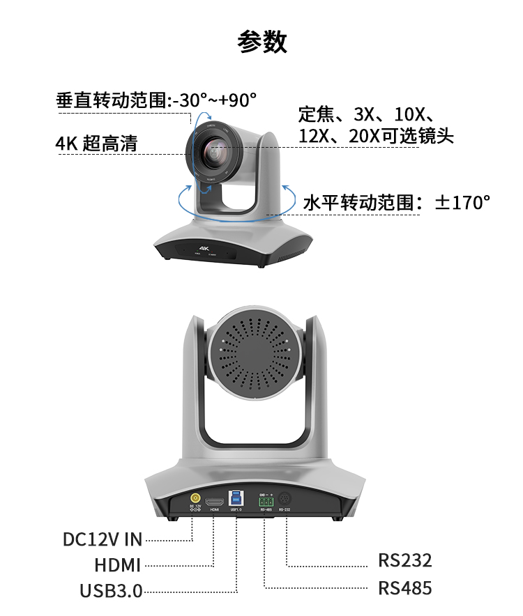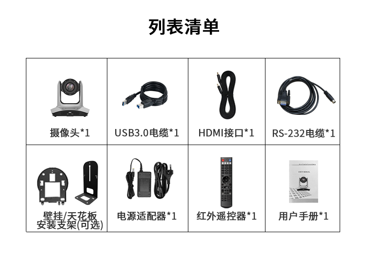 随机附件 | DC12V电源适配器,IR遥控器,操作说明书,USB3.0视频线,RS-232串口线,支架 |