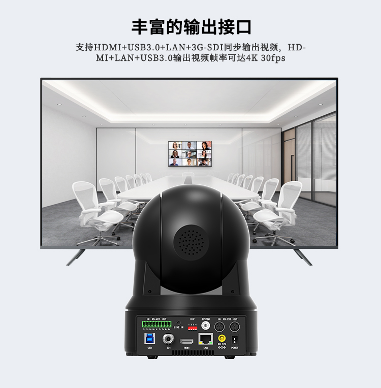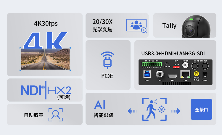 (注:开启AI智能跟踪和自动取景功能,USB3.0支持4K30分辨率输出,HDMI+IP支持1080p60分辨率输出,3G-SDI无画面输出,三接口能同时输出。)