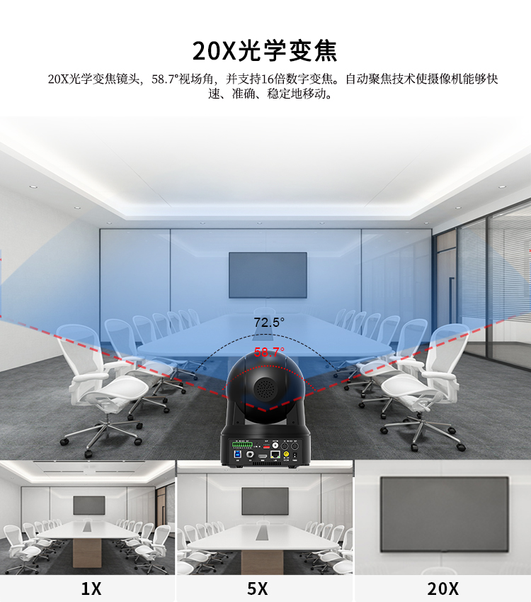 采用高品质超长焦镜头,光学变焦达到20倍,并支持16倍数字变焦,58.7°无畸变水平视角。