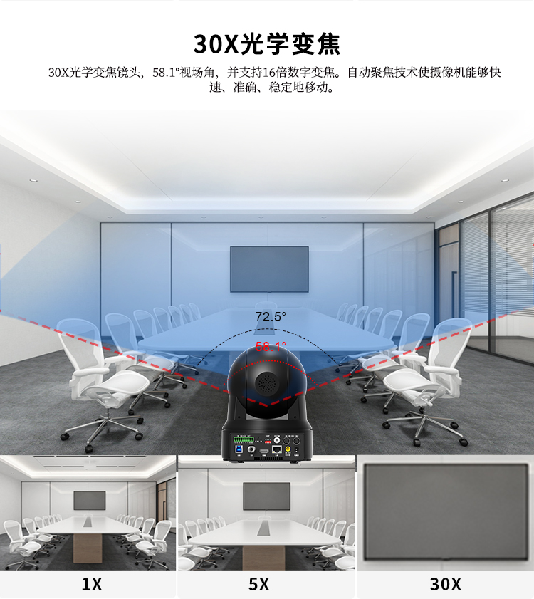 采用高品质超长焦镜头,光学变焦达到30倍,并支持16倍数字变焦,58.1°无畸变水平视角。