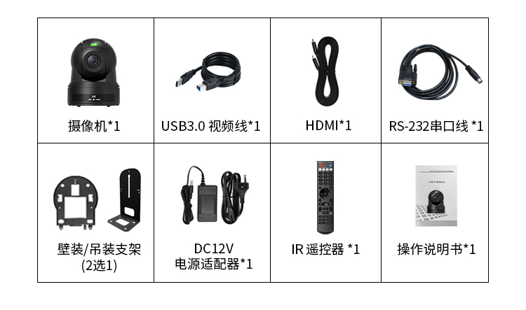 DC12V电源适配器,IR遥控器,操作说明书,USB3.0视频线,RS-232串口线,支架