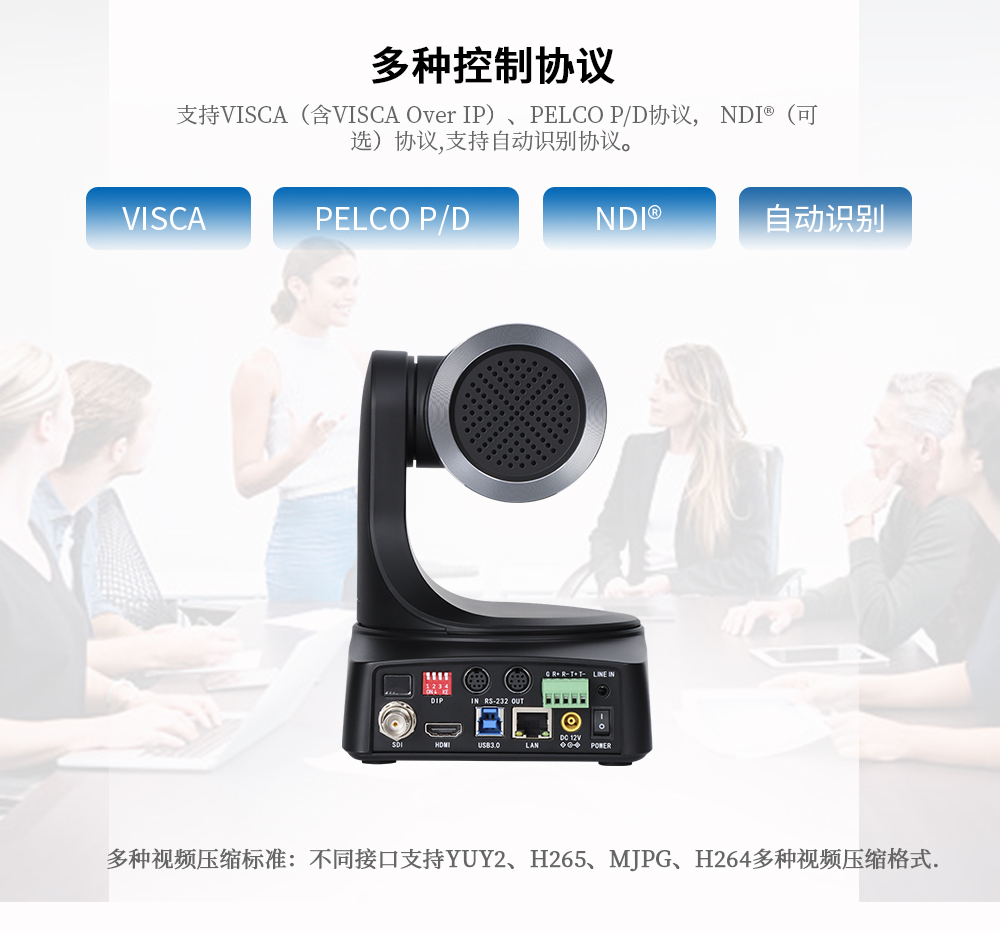 协议 | TCP/IP, HTTP, RTSP, RTMP, RTMPS, SRT, Onvif, DHCP, VISCA Over IP, NDI®HX2(可选) |